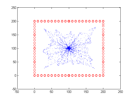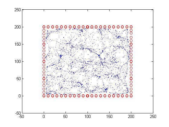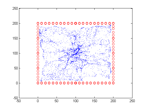 仿真参数设置:仿真中设置节点5000个,边界节点80个。节点随机分布在一个200*200的矩形范围之内,边界节点均匀分布在举行的边上。设定单条传输距离为10。节点初始位置设置为(100,100)